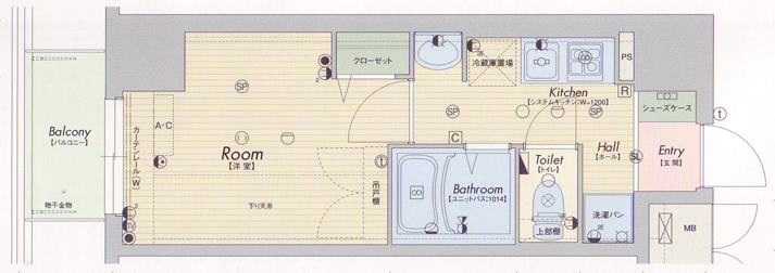 オートロック、モニタ付インターホン、インターネット対応、駐輪場、BS、CS、エレベータ、宅配ボックス、エアコン、フローリング、セパレート、洗濯パン、システムキッチン、ガスコンロ、給湯器、ウォッシュレット、洗面台、シャンプードレッサー |